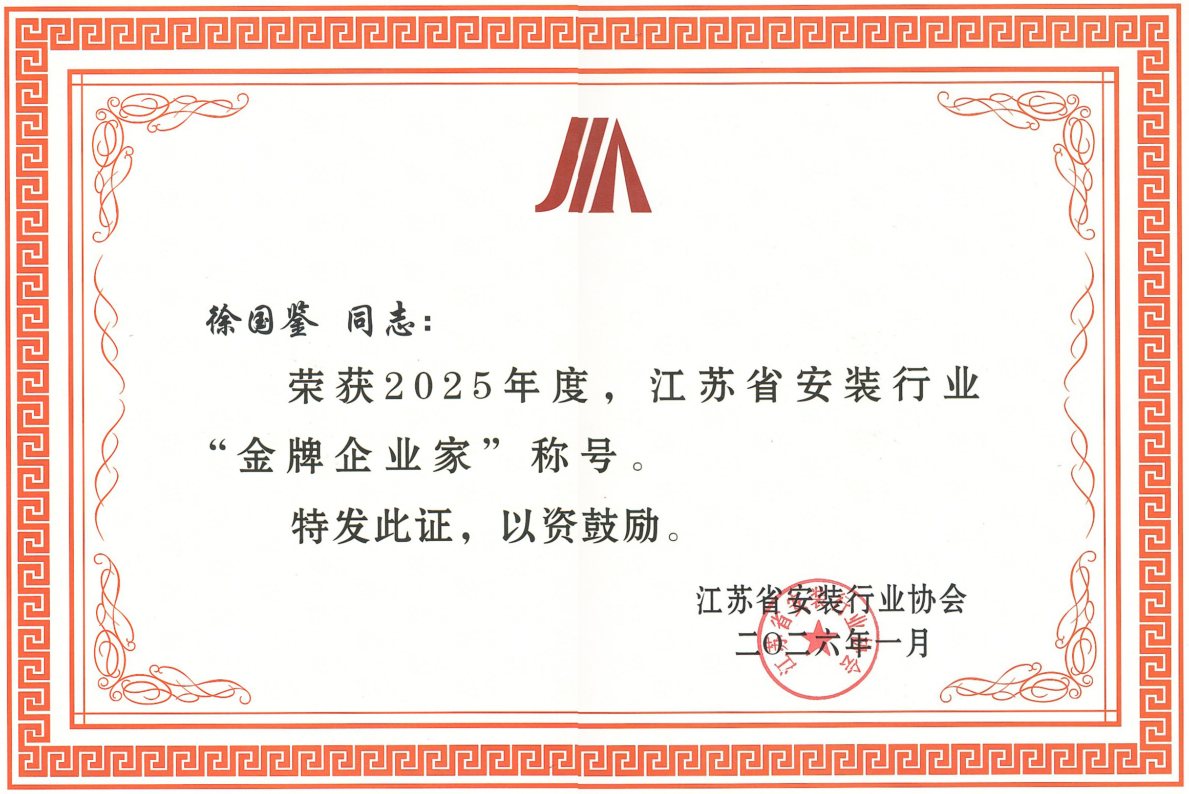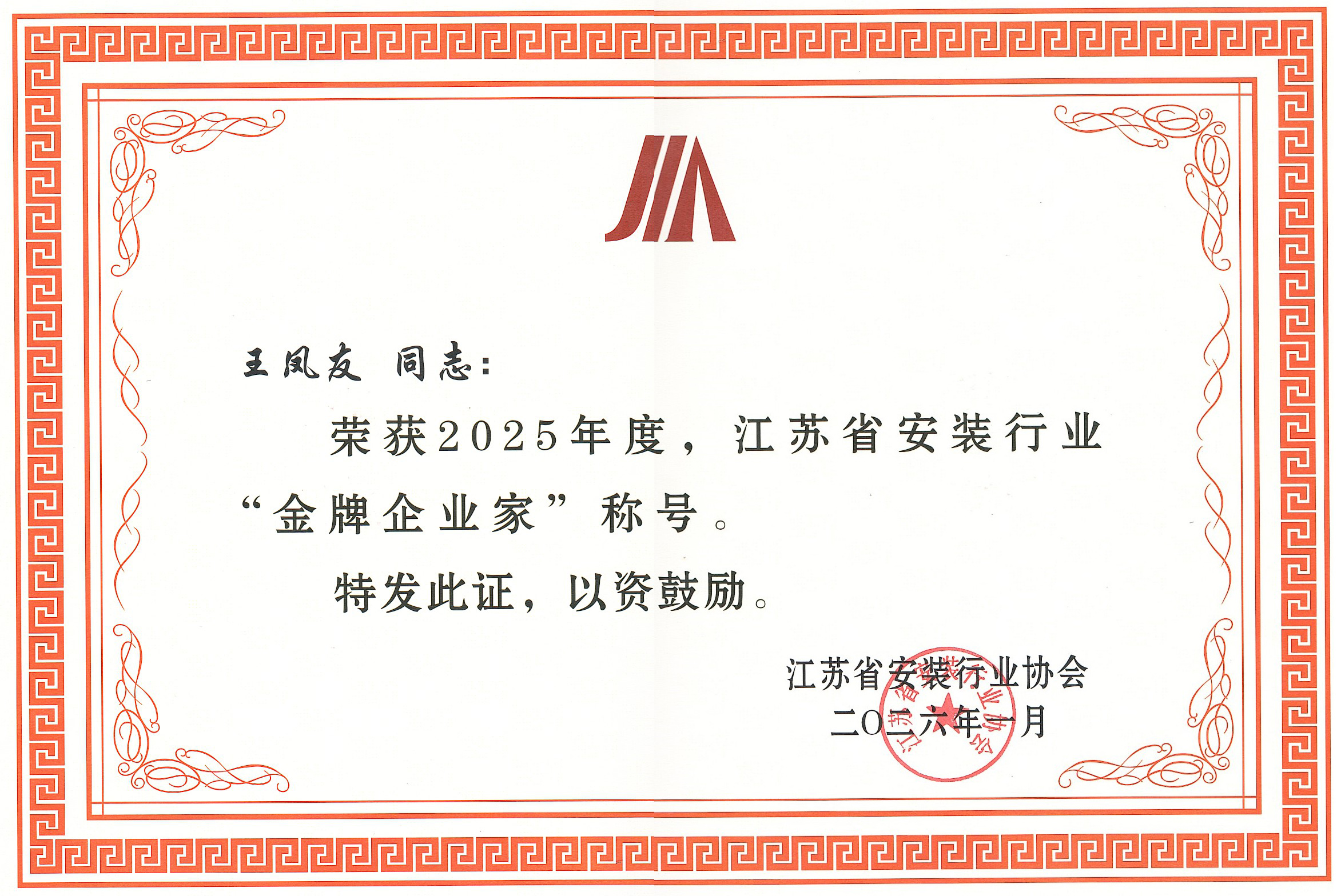 集团公司多名同志荣获江苏省安装行业协会2025年度“金牌企业家”称号
